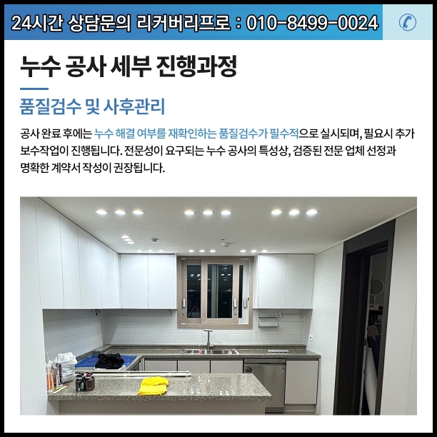 분쟁 시 생활분쟁조정위원회나 법률 상담을 추천하여 고객님께서 적절한 보상을 받도록 지원합니다. 누수공사는 건물의 안정성을 유지하고 고객님의 건강과 재산을 보호하며, 이웃 관계를 고려하는 데 중요합니다. 저희 리커버리프로는 경험과 전문성을 바탕으로 고객님의 신뢰에 응답합니다. 누수 문제로 어려움을 겪고 계시다면, 언제든 저희 리커버리프로에 문의해 주십시오.