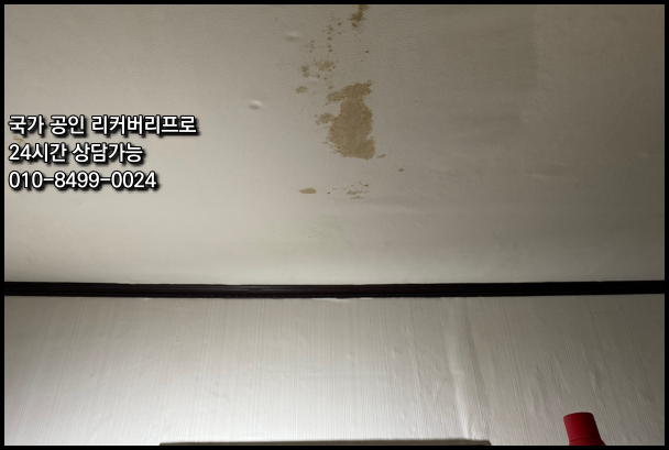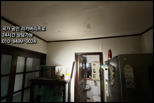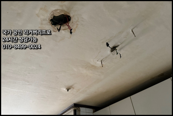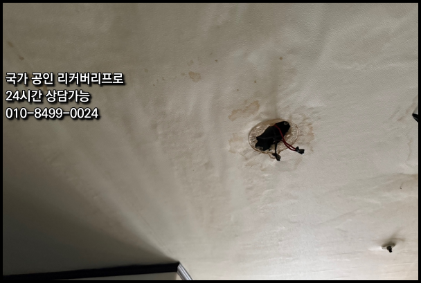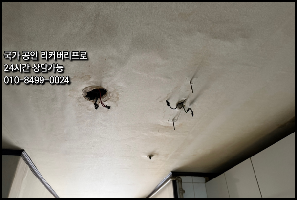 도배가 타들어가 그을음이 발생했던 현장이었습니다. 저희 리커버리프로는 국가공인 실내건축업 자격과 건물위생관리업 등록증을 보유한 전문 기업으로, 누수 탐지부터 복구, 특수 청소까지 모든 과정을 하나의 팀으로 체계적으로 처리하며 고객님의 편의를 최우선으로 고려합니다. 현장에서 윗집 바닥의 누수가 아랫집 천장 전기 설비로 이어지는 경로가 명확히 드러났으며, 이는 윗집 배관 문제로 인한 누수일 가능성을 나타냅니다.