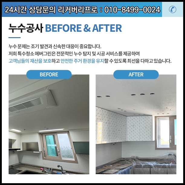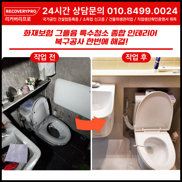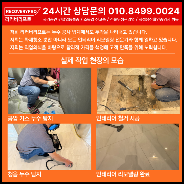 고객님께서는 이러한 누수 피해를 겪고 계신 아파트 주민으로서, 저희 리커버리프로가 국가공인 실내건축업 자격과 건물위생관리업 등록증을 보유한 전문 기업으로서 누수 탐지부터 복구, 특수 청소까지 체계적으로 처리하는 과정을 자세히 살펴보시며 참고하시기 바랍니다.