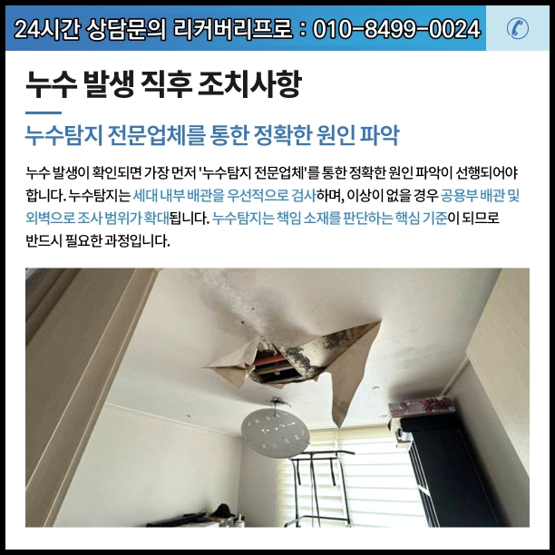 더불어 세면대, 욕실, 주방 등에서 물을 과도하게 사용하거나 배수구 관리를 소홀히 하는 사용자 과실 역시 누수로 이어질 수 있습니다. 누수는 대체로 배관의 노후화, 방수층 손상, 시공 불량, 외부 환경, 그리고 사용자 부주의에서 복합적으로 발생하므로, 누수 점검 시 전문가의 진단이 필수적입니다. 저희 리커버리프로는 경기도, 서울, 인천 등 수도권에서 신속히 출동하여 이러한 문제를 해결합니다. 저희 리커버리프로는 누수 피해가 이웃 간 분쟁으로 이어지지 않도록 원인 파악부터 복구, 사후 관리까지 책임감 있게 처리합니다. 분쟁 시 생활분쟁조정위원회나 법률 상담을 추천하여 고객님께서 적절한 보상을 받도록 지원합니다.