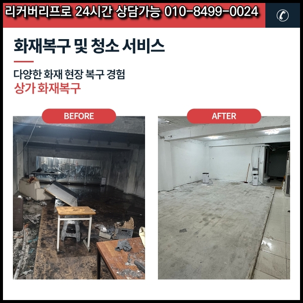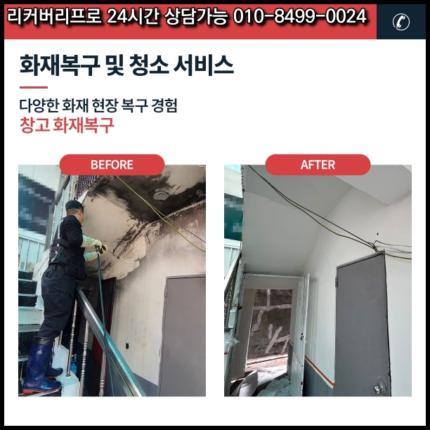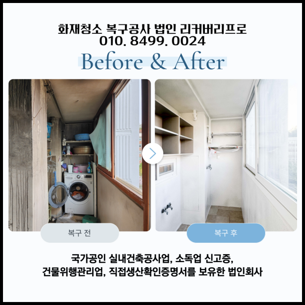 이렇게 저희 리커버리프로는 화재로 피해를 입은 경기도의 3층 빌라를 체계적으로 복구하여 고객님이 안심하고 생활할 수 있는 공간으로 만들었습니다. 화재 청소, 구조 점검, 복구 공사, 인테리어 리모델링, 생활환경 세팅까지 모든 과정을 전문적으로 처리했으며, 보험 청구 지원과 물품 보관 서비스를 통해 고객님의 부담을 줄였습니다. 화재 복구는 건강과 안전을 지키는 중요한 작업입니다.