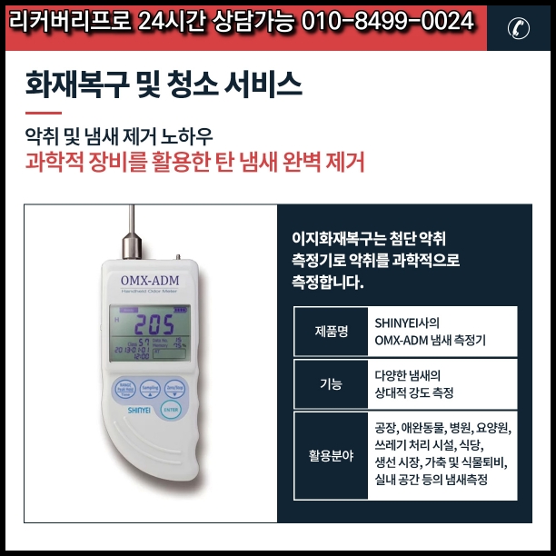 화재 후 잔류하는 유해물질은 건강에 심각한 영향을 미칠 수 있습니다. 그을음, 포름알데히드, 벤젠, 미세먼지(PM2.5)는 기관지염, 천식, 폐암, 심혈관질환 등 만성 질환을 유발하거나 악화시킬 수 있습니다. 특히 장기적인 노출은 만성 염증, 신경계 장애, 간 및 신장 손상을 초래할 수 있습니다. 이러한 위험을 줄이기 위해, 저희 리커버리프로는 과학적 장비를 활용해 유해물질을 철저히 제거했습니다.