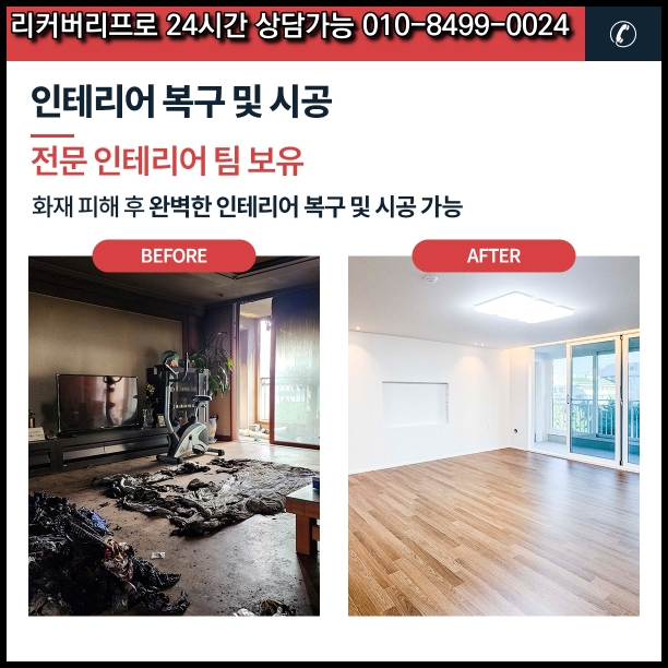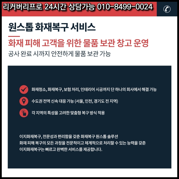 인테리어 리모델링, 전기 점검, 보험 처리 등 다양한 서비스에 대해 전문 상담원이 친절히 안내드리고 있으니, 언제든 문의 주시기 바랍니다. 이처럼 리커버리프로는 지역사회의 쾌적한 환경 조성을 위해 최선을 다하며, 고객님의 신뢰를 바탕으로 더욱 발전해 나가겠습니다. 감사합니다.