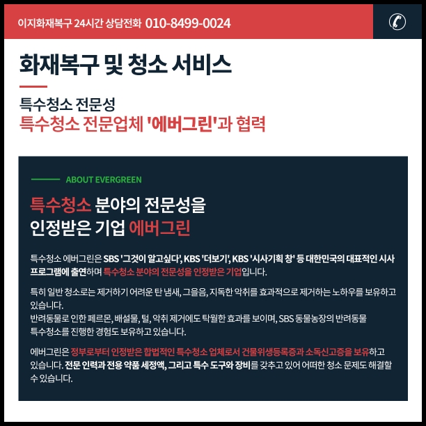 안녕하세요. 리커버리프로입니다. 오늘은 저희가 진행했던 화재청소 및 복구공사 사례와 함께 최근 인천에서 발생한 안타까운 화재 사고 소식 및 이를 계기로 마련된 복지 사각지대 해소 방안에 관한 내용을 전해드리고자 합니다. 지난 화재 현장에서 저희는 불과 24시간 만에 전열기 배관 교체와 천정 석고 작업을 완료하며 신속한 복구 서비스를 제공했습니다.