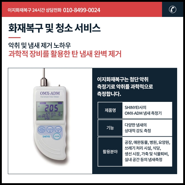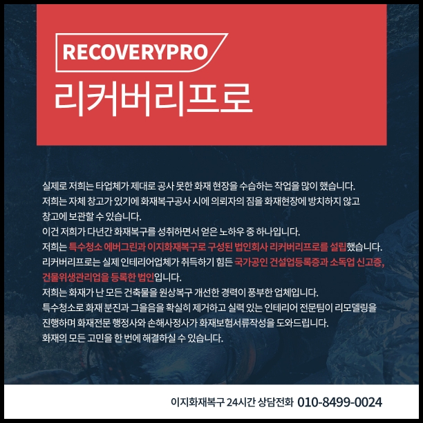 저희 리커버리프로는 화재 복구 전문 업체로서 시설 복원을 통해 고객의 일상 회복까지 도움을 드리고자 합니다. 드라이아이스 클리닝, 샌드블라스팅, 특수 세정제를 활용한 탈취 공정 등 전문적인 기술로 화재 흔적을 효과적으로 제거합니다. 또한 화재보험 청구 업무 대행, 물품 보관 서비스 등 종합적인 지원을 통해 고객의 부담을 덜어드립니다. 화재 발생 후 빠른 복구가 필요하시다면 언제든 저희 리커버리프로에 연락해 주세요.
